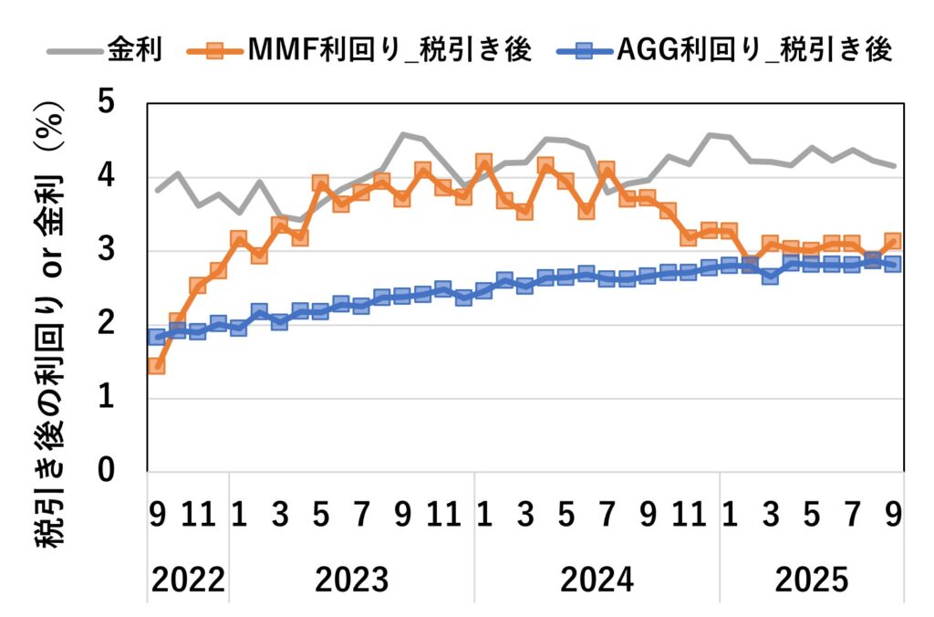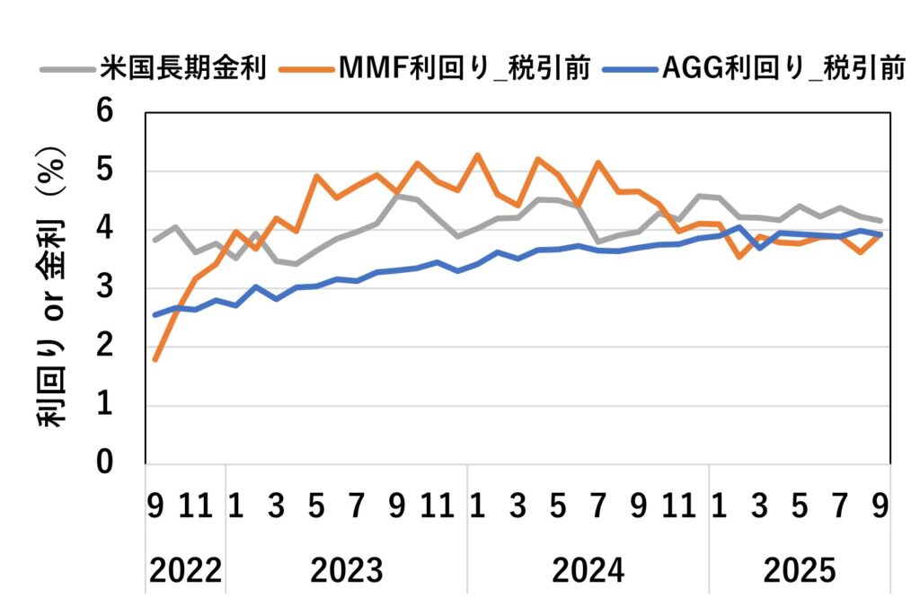 2枚目のグラフは米国長期金利と税引き後のMMF(または【AGG】)の利回りを示したものです。
