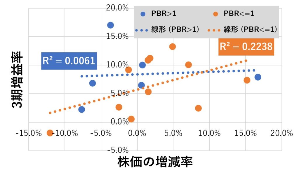プロットのパターンを見ると、PBR1以下の銘柄については、3期増益率と株価増減率に正の相関があるかも、といったところですね。ただ、R^2値はあまり高くないので、参考程度でしょうね。