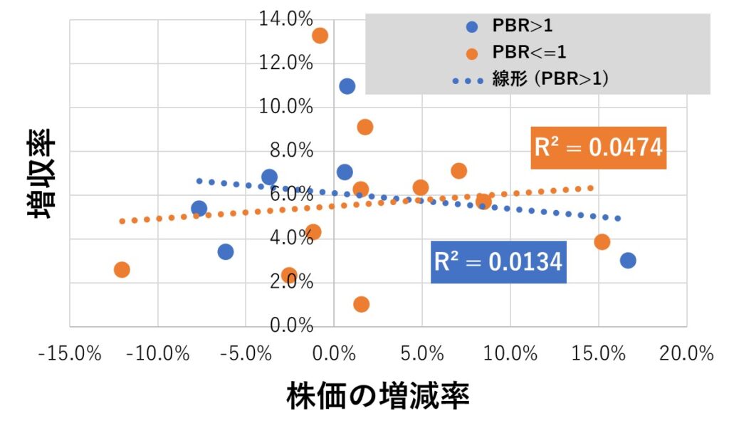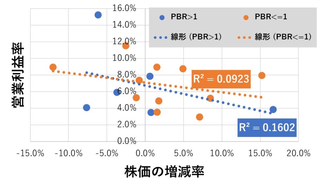増収率や営業利益率についてはあまり好ましい結果ではなかったのですが、少なくともPBRが1以下の銘柄は「営業利益が10%以上だと良いのでは?」という感じみたいです。