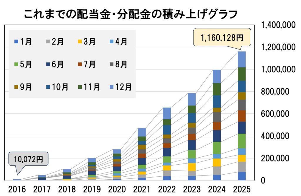積上げグラフを見ると、投資を始めた2016年から順調に育っていることが分かりますね。