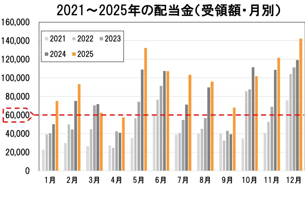 フェーズ2では、楽天VTIの積立額が月3万円以上に増えますが、2025年の実績ベースでは、円建ての配当金だけで3万円を超えている月はおよそ半分なので、単純に赤字になるからです。