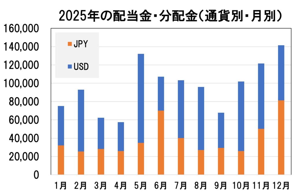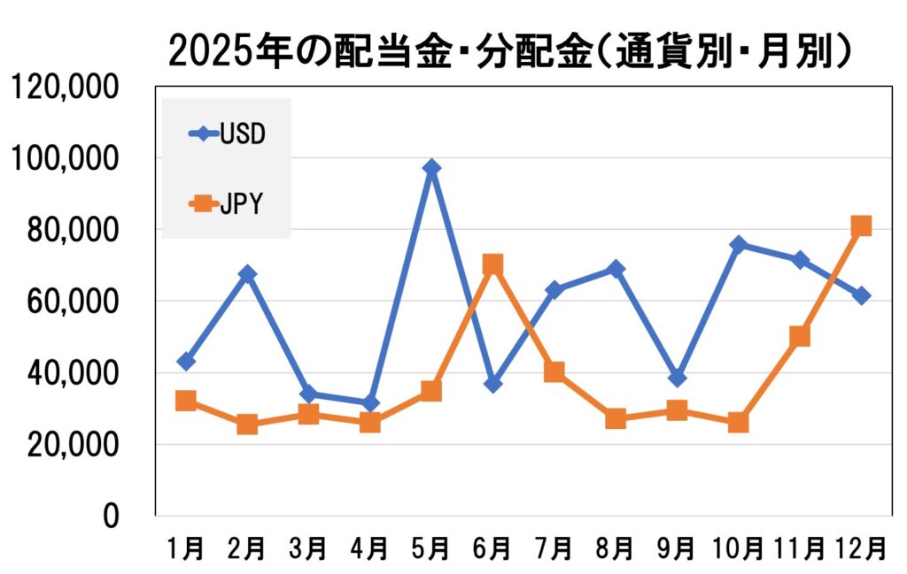 月ごとの推移を見るために、2025年の一年間で受け取った配当金・分配金(税引き後)の推移をグラフにしてみました。