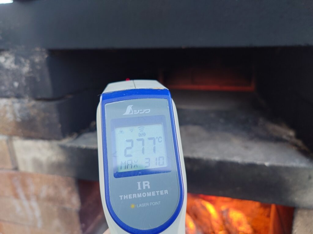 しばらくすると、↑の画像のとおりピザ窯本体が温まり300℃を超えます。画像では277℃ですが、この日の最高は310℃でした。