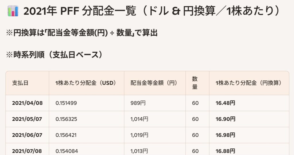 2. 税引き前のPFFの分配金(ドル・円の両方)を抽出し、時系列で整理する。